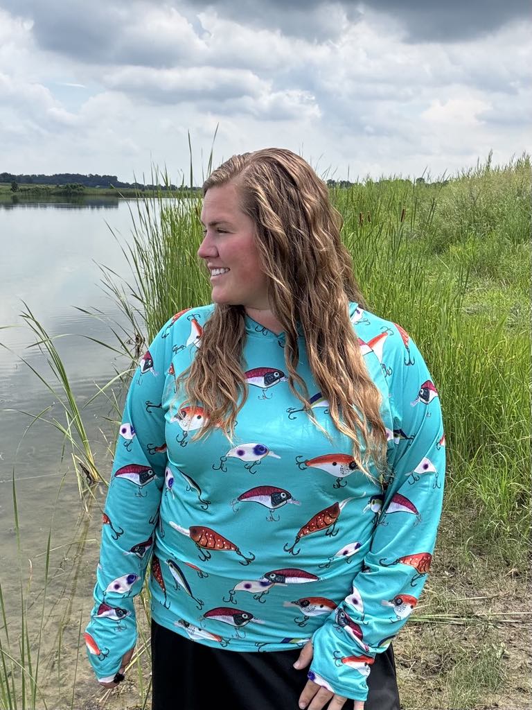 Women’s Crankbait Print Performance Fishing Hoodie Make a splash in style with our vibrant Crankbait Print Hooded Fishing Shirt — made for women who love to fish hard and look good doing it. Designed with breathable, quick-dry fabric, this UPF 50+ sun shirt features: • A lightweight hood for extra sun protection • Built-in thumbholes to keep sleeves in place while casting • A bold, playful crankbait lure print that celebrates your fishing obsession • A flattering fit that’s made for movement, whether you’re on the kayak, boat, or bank Perfect for chasing bass or turning heads at the boat ramp.